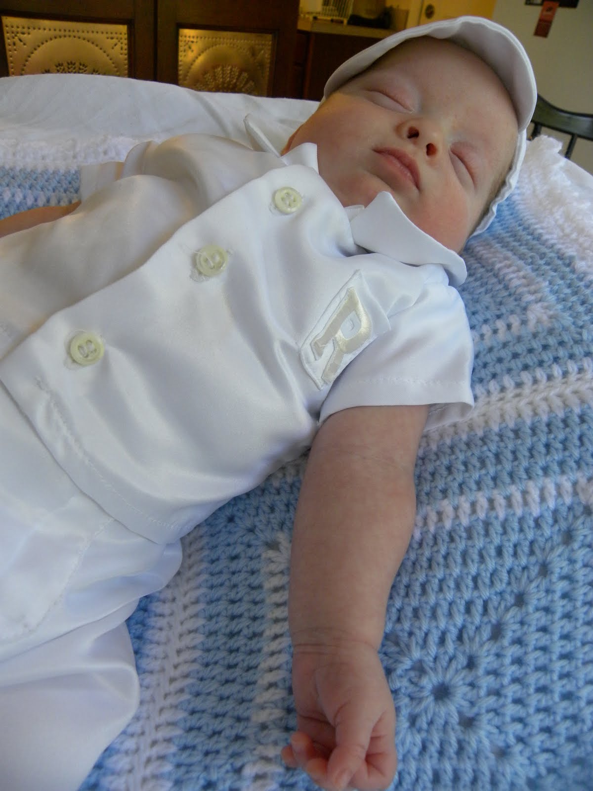 Rogan...see the "R" on his pocket? Juanita Dunlap made the darling blessing outfits.